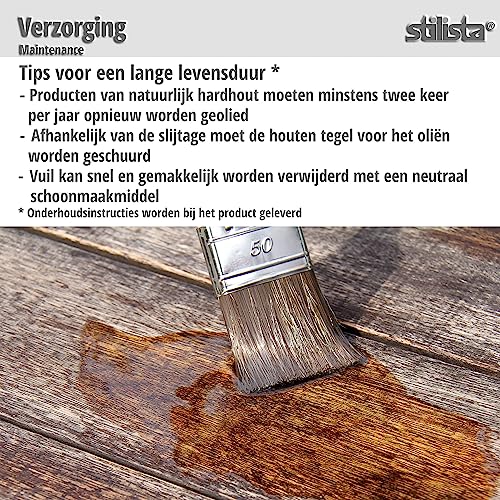 Onze houten tegels van STILISTA zijn gemaakt van weerbestendig en robuust, FSC-gecertificeerd acaciahout, dat na productie wordt behandeld met een geschikte onderhoudsolie.